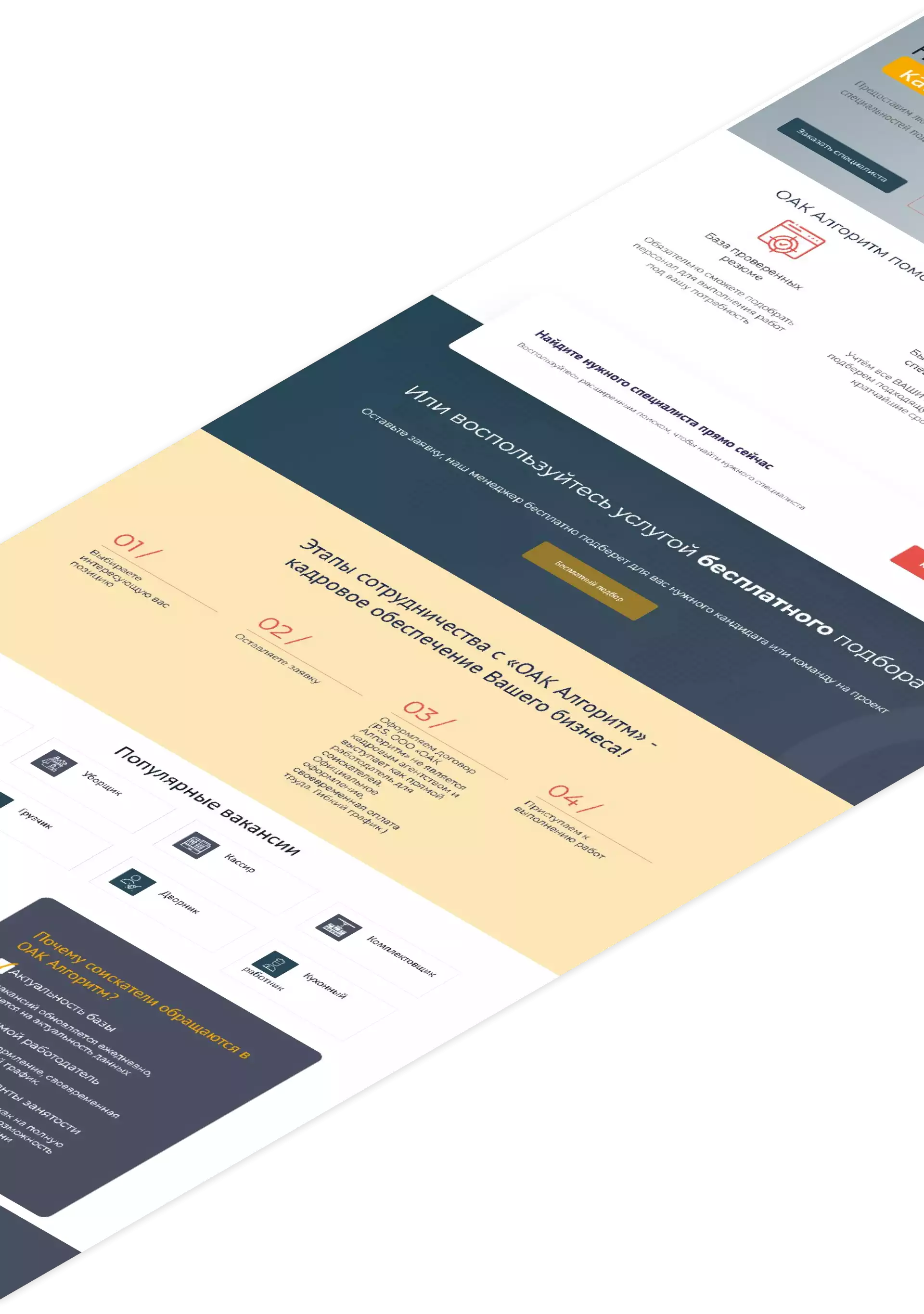 Разработка сайта для компании, предоставляющей услуги по подбору персонала, аутсорсингу и размещению вакансий. Создание индивидуального дизайна, подчеркивающего деловой стиль и ориентированность на результат. Верстка и программирование многостраничного сайта с интуитивной навигацией и адаптацией под мобильные устройства.