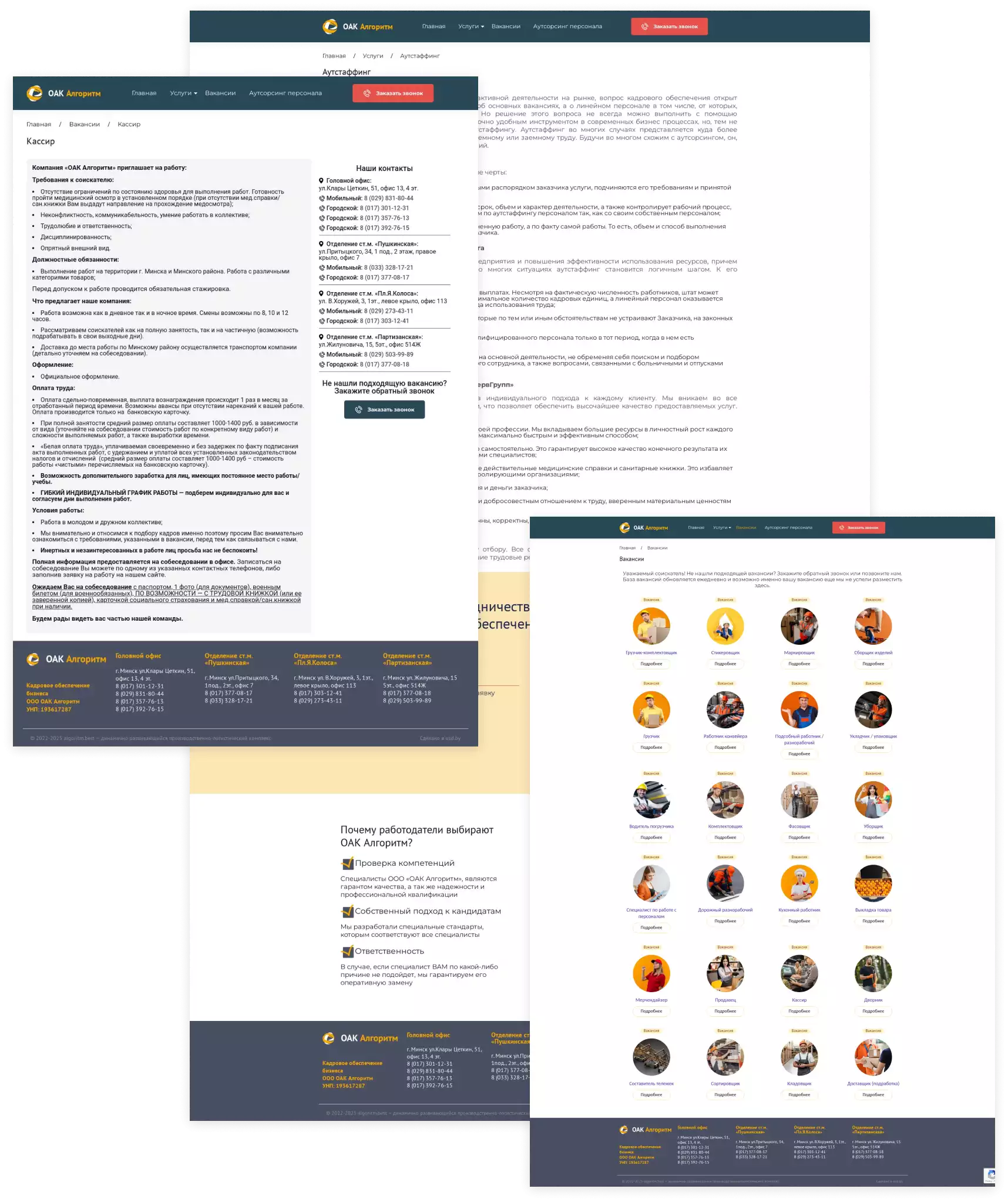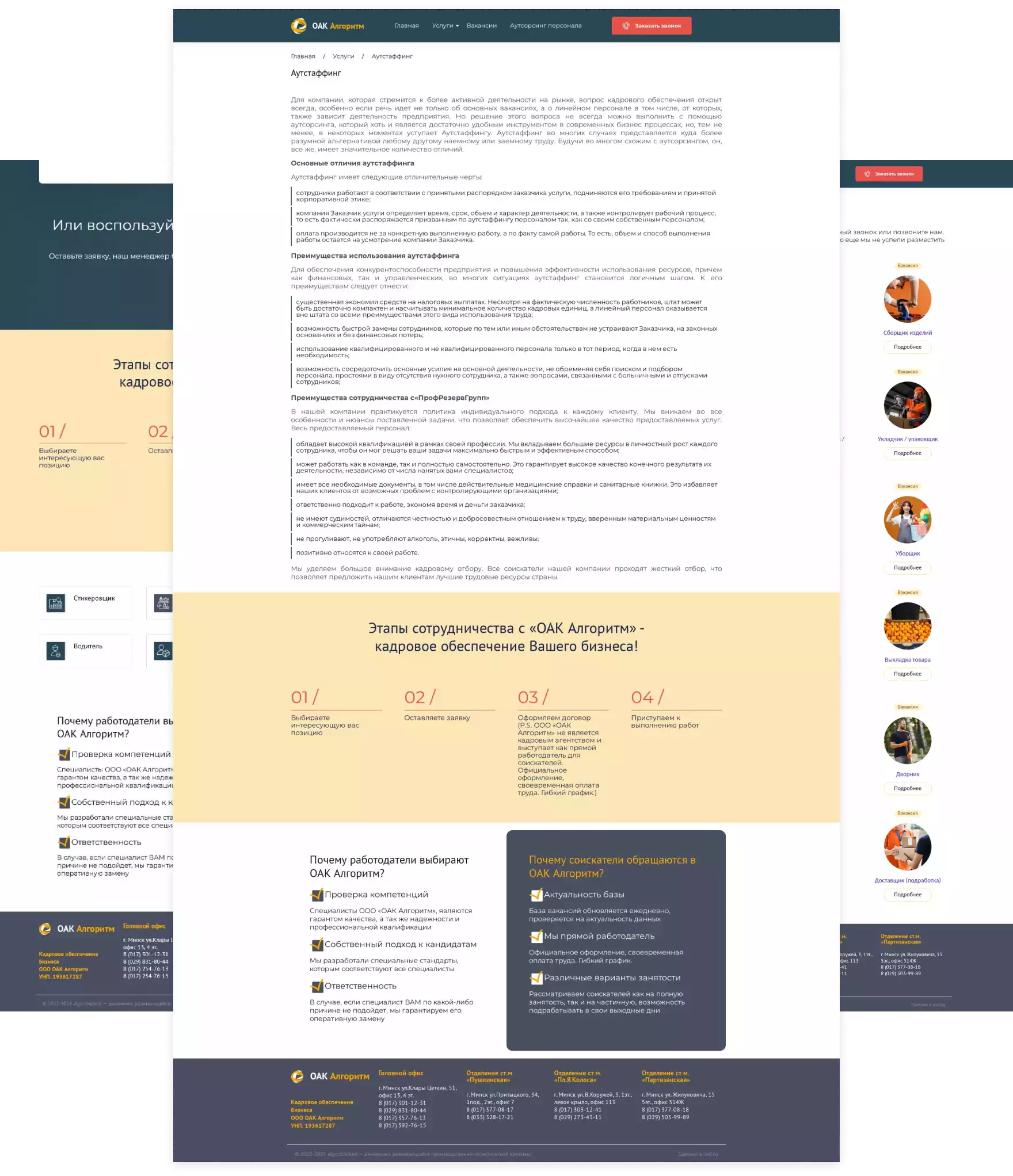 Индивидуальный дизайн главной страницы с чёткой блочной структурой, отражающей профессионализм и надежность компании по подбору персонала. Размещение ключевой информации об услугах аутсорсинга, подборе сотрудников и размещении вакансий.