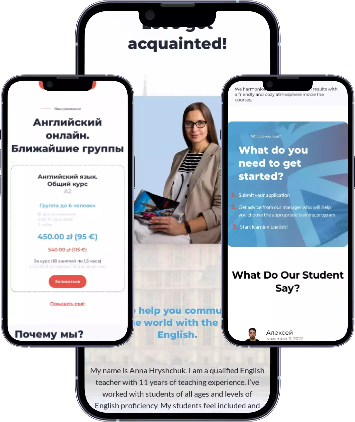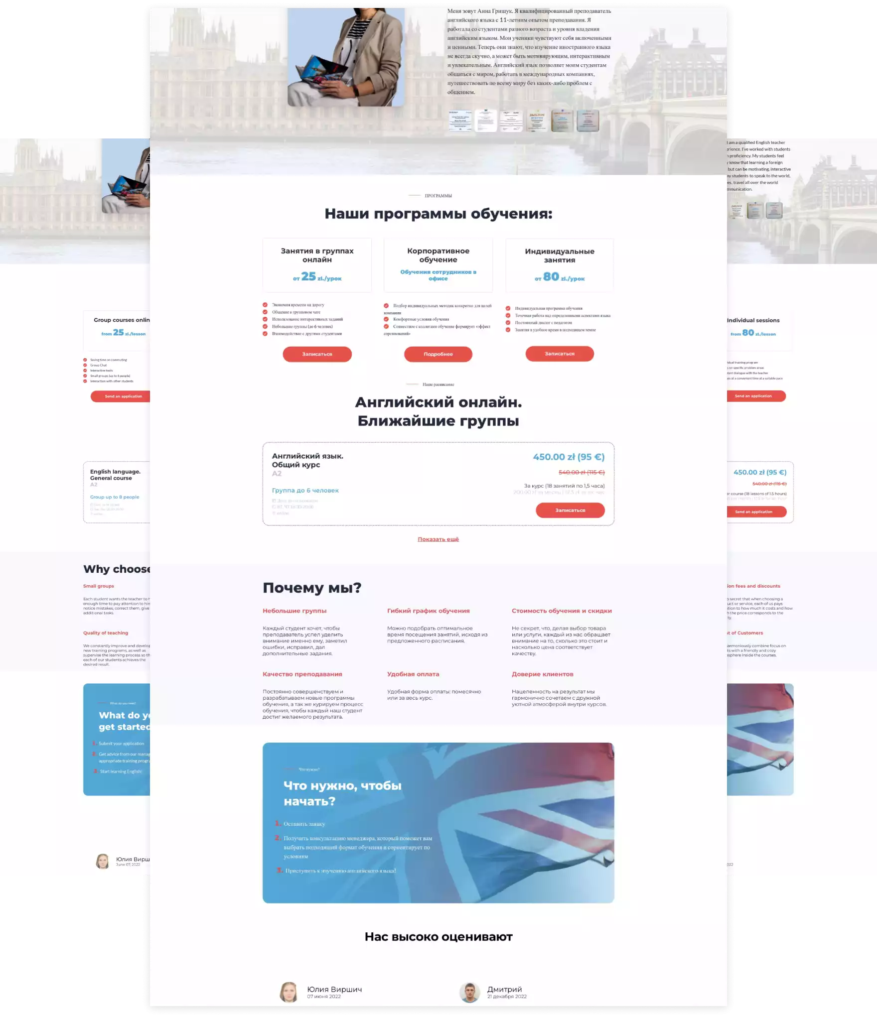Сайт представляет из себя одностраничник (лендинг пейдж) поэтому вся информация по блочно представлена на главной странице. Блок с УТП, информацией о преподавателе, тарифах, контактная информация, отзывы и т.д.