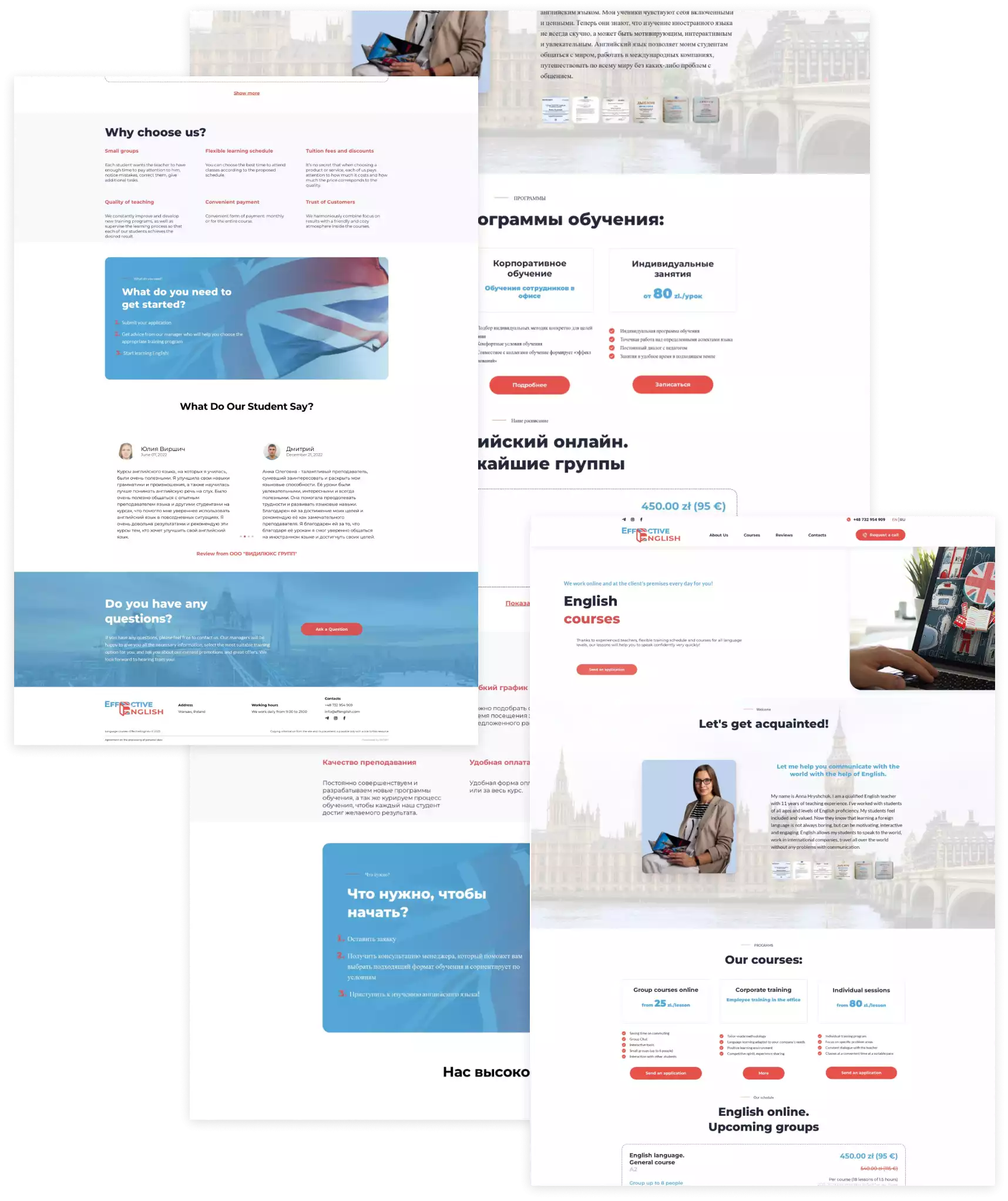 Был разработан сайт в видео лендинга для курсов английского языка в Варшаве. Сайт двуязычный, был разработан дизайн, выполнена верстка и подключение системы управления для удобного редактирования контента.