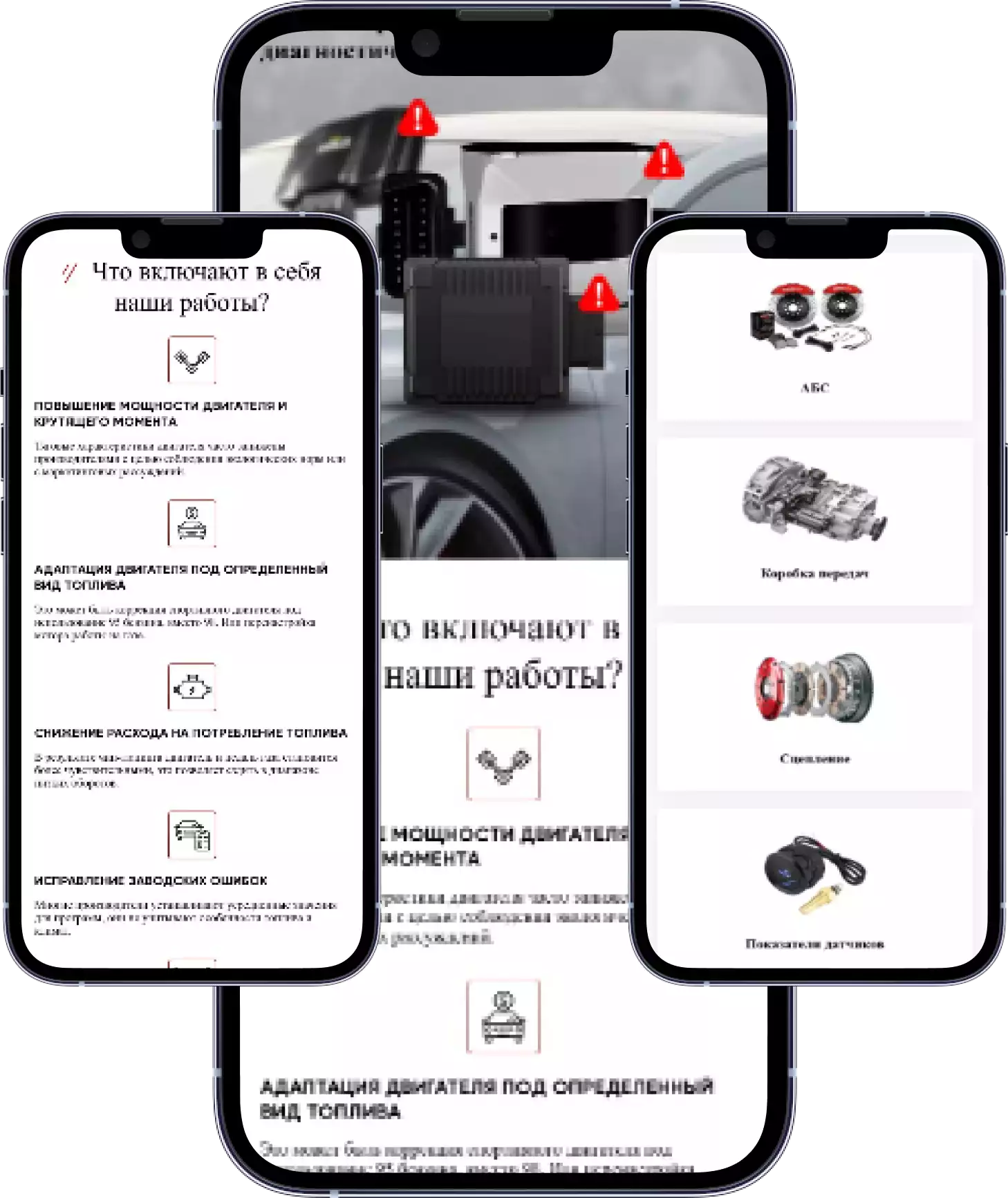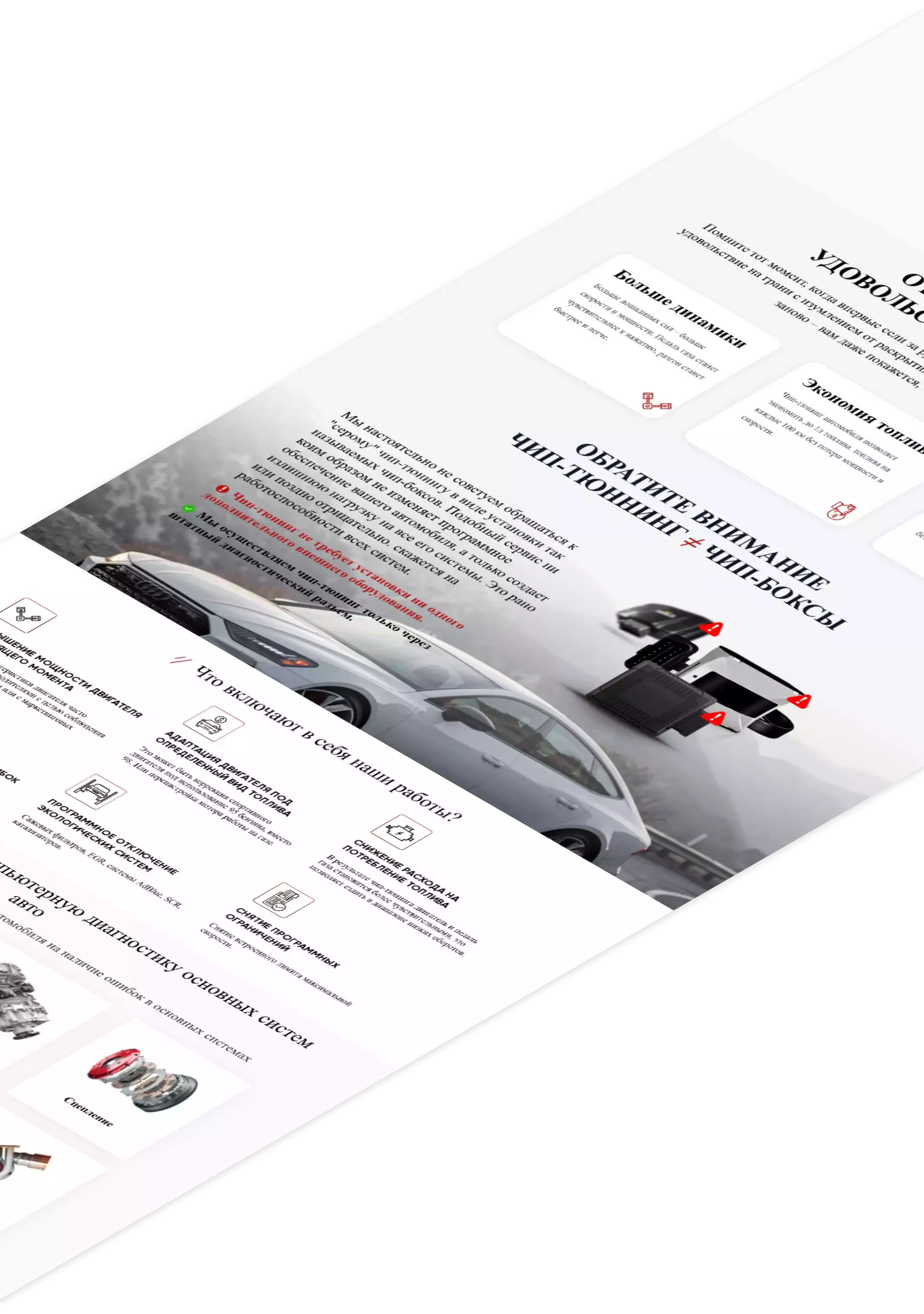 Индивидуальный дизайн главной страницы с чёткой и технической блочной структурой, подчёркивающей профессионализм и надёжность компании по чип-тюнингу. Размещение ключевой информации об услугах по улучшению работы двигателей, преимуществах применения чип-тюнинга и гарантии качества.